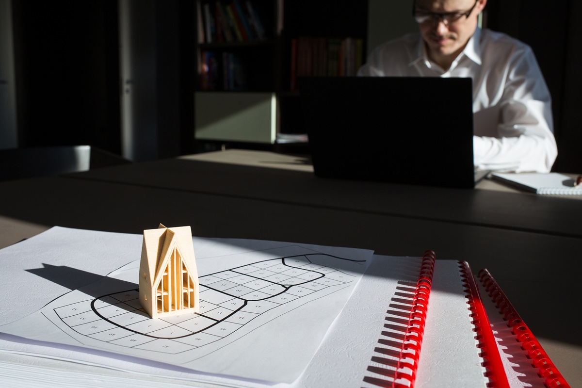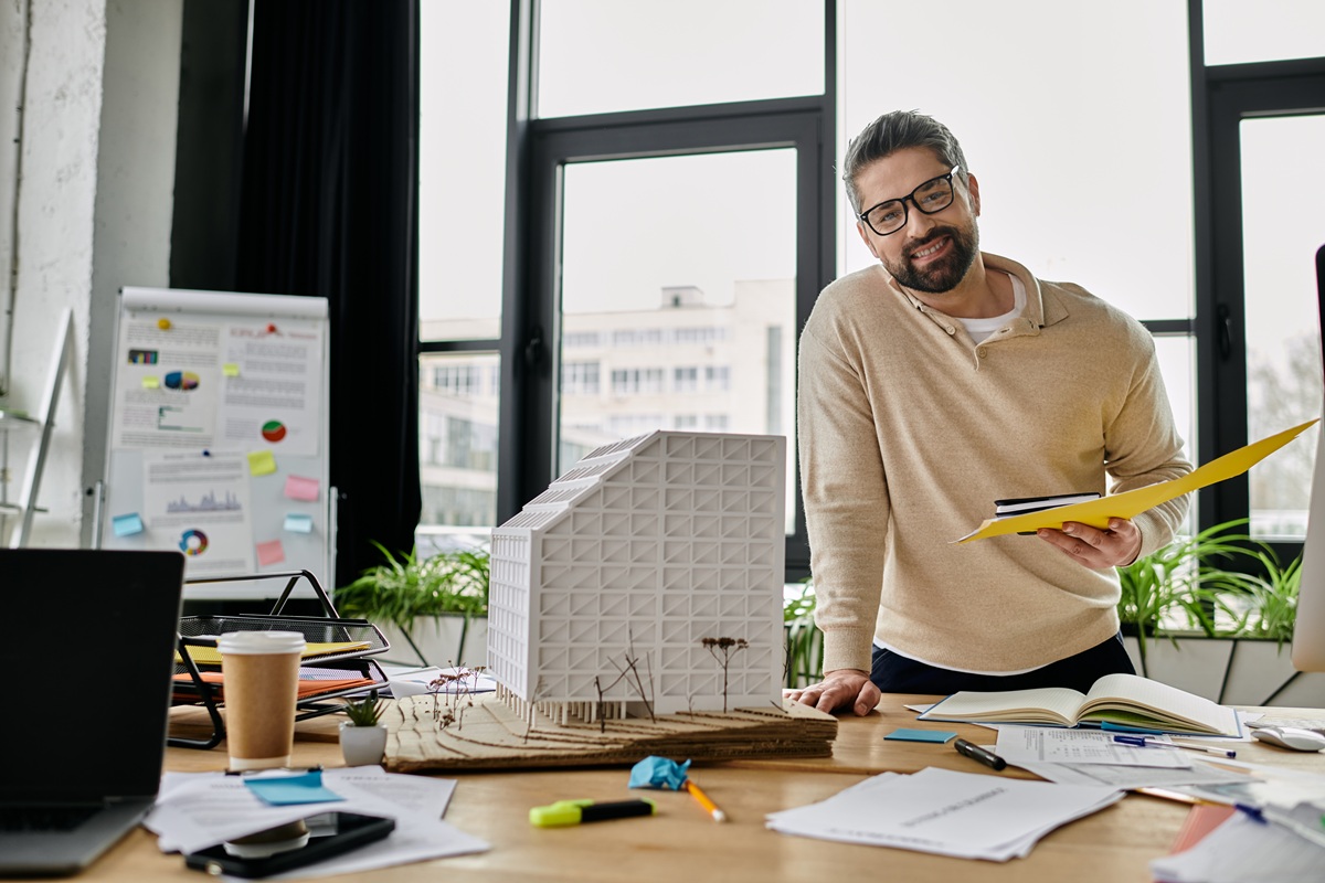 A handsome businessman with a beard reviews blueprints and a model building in a modern office.