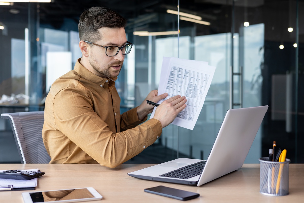 A young serious male businessman conducts online business training, a conference, sitting in the office at the table. Shows documents, a project on the laptop monitor. Explains, advises.